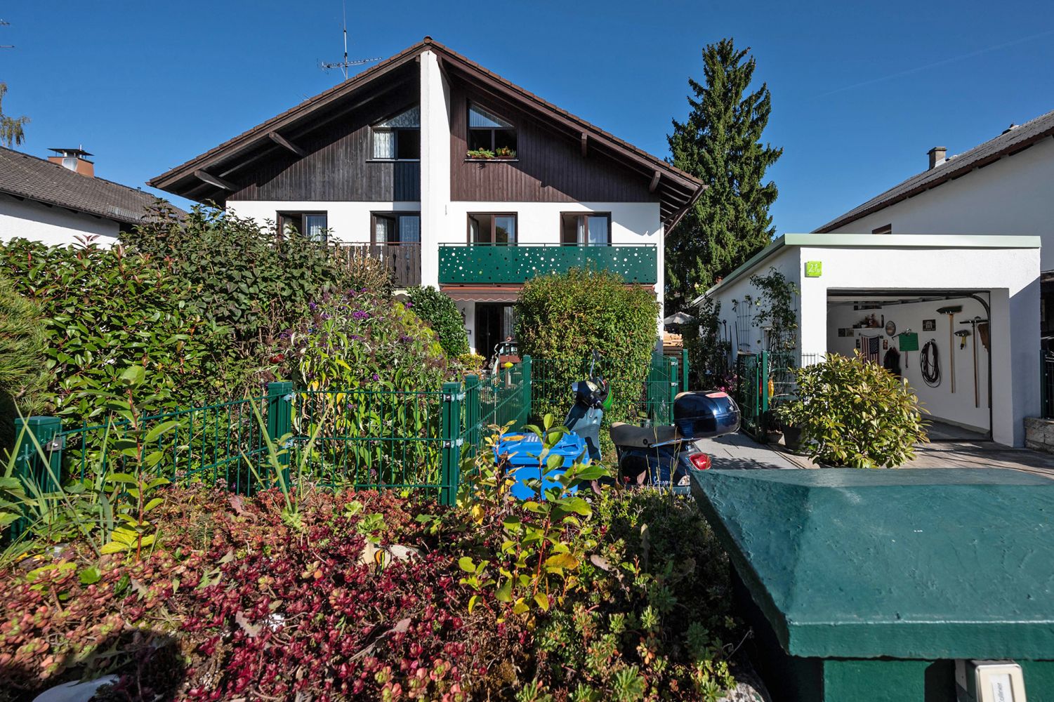 Der liebevoll angelegte Garten samt Außenbereich, das Gartengerätehaus und die Einzelgarage mit Grube sowie der vorgelagerte Stellplatz runden das Angebot ab.