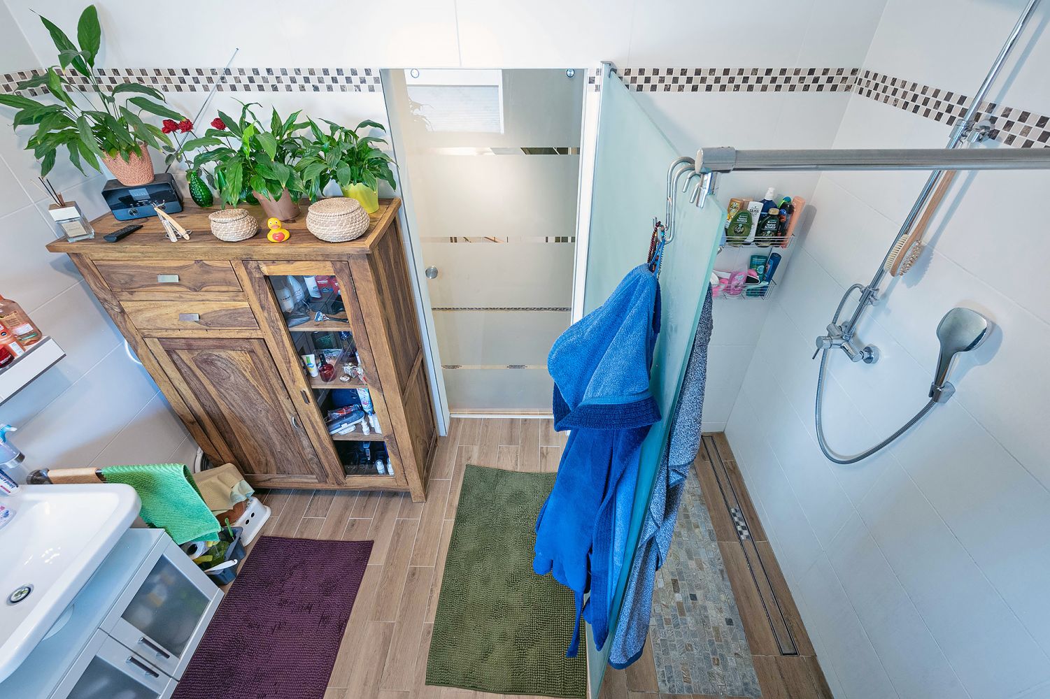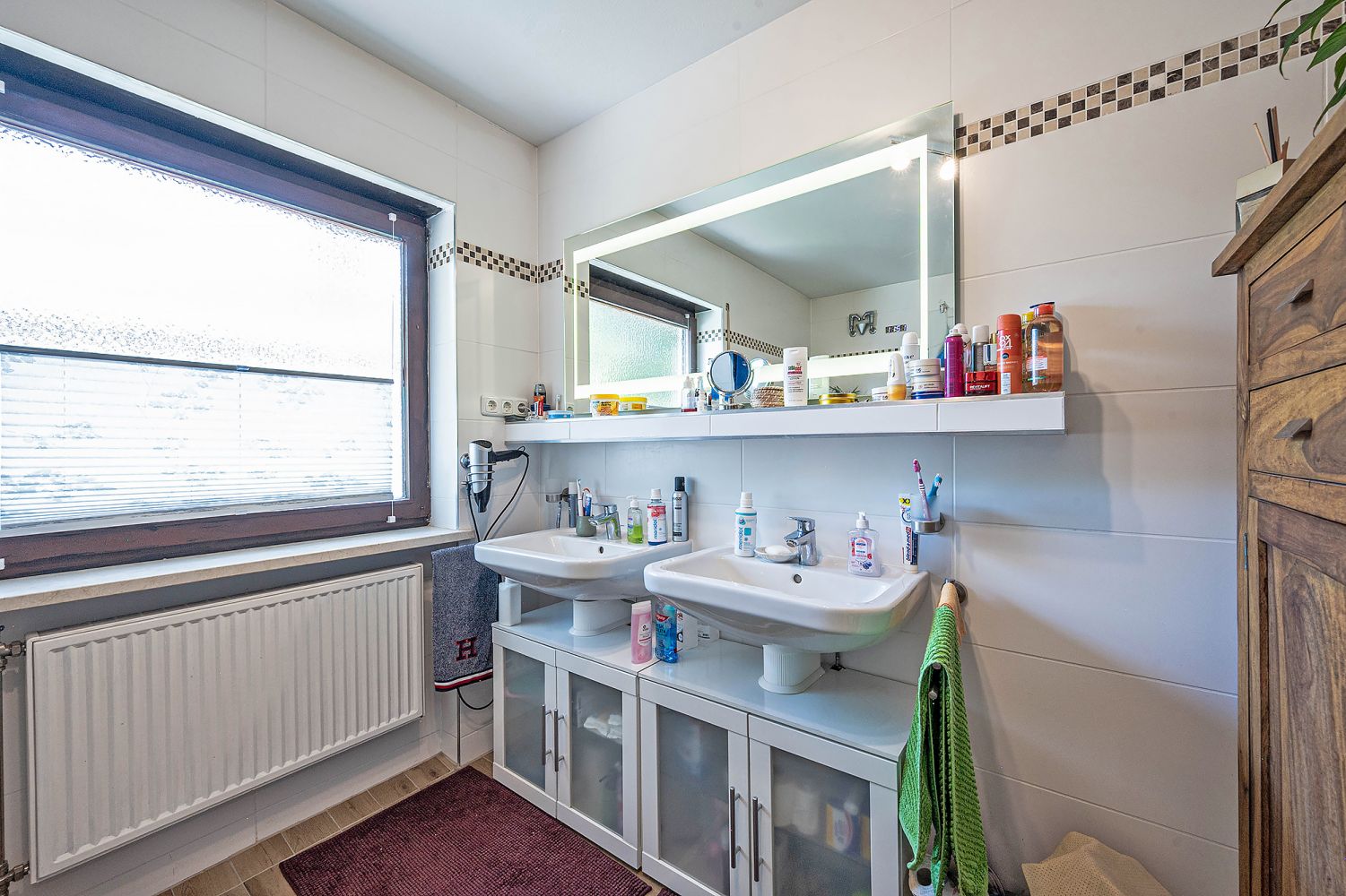 + Badezimmer im OG, ausgestattet mit geräumiger Dusche und Doppelwaschbecken