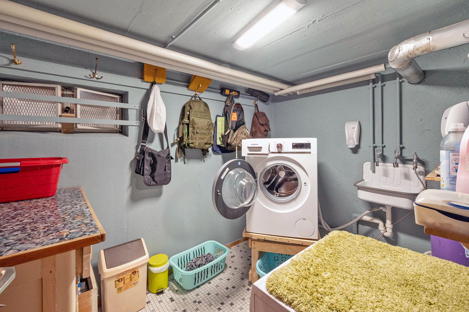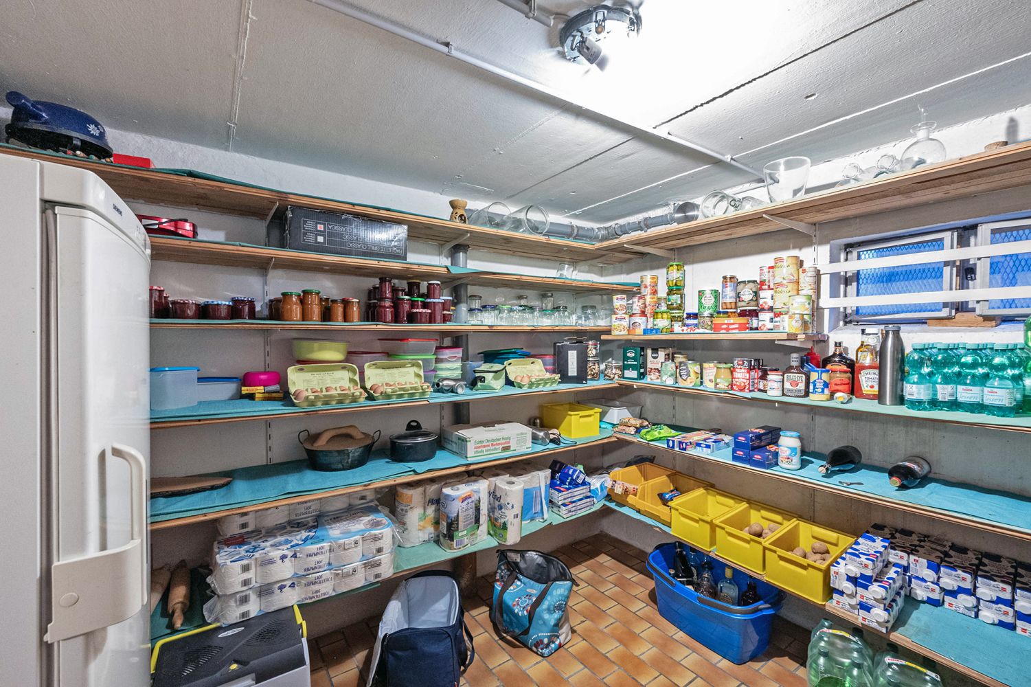 Reichlich Stau- und Vorratsflächen finden sich im Kellergeschoss, das aus 5 Räumen besteht: einem geräumigen Hobbyraum, 2 Vorratsräumen, dem Heizungsraum und der Waschküche.