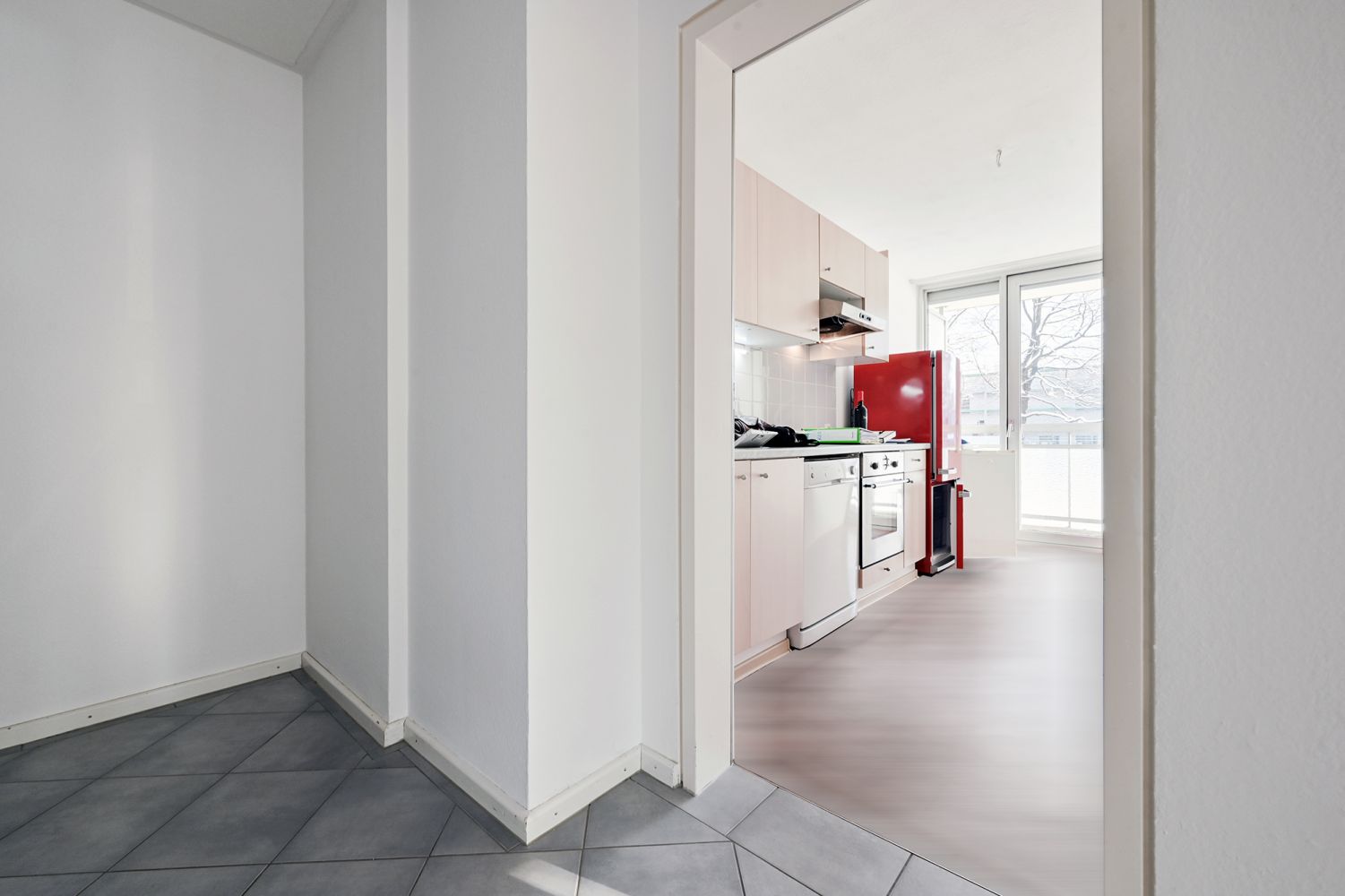 + räumlich abgetrennte Küche mit kleiner EBK (Herd, freistehender Kühlschrank, Platz für Geschirrspüler) und Zugang zum ostseitigen Balkonabschnitt