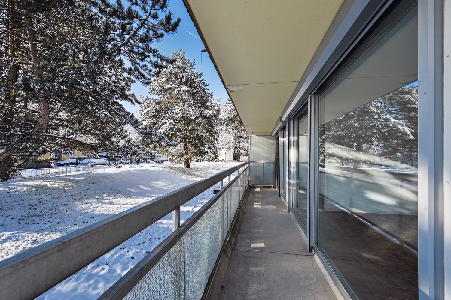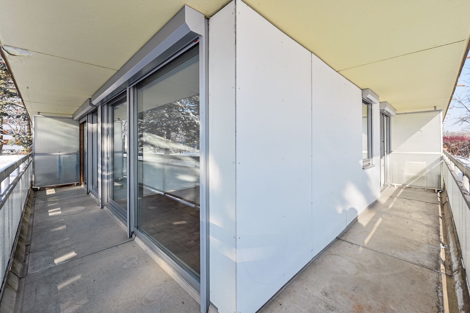 Ein Highlight ist der umlaufende Balkon, der sowohl vom Schlaf- wie auch vom Wohnzimmer südseitig sowie von der Küche aus ostseitig begehbar ist.
