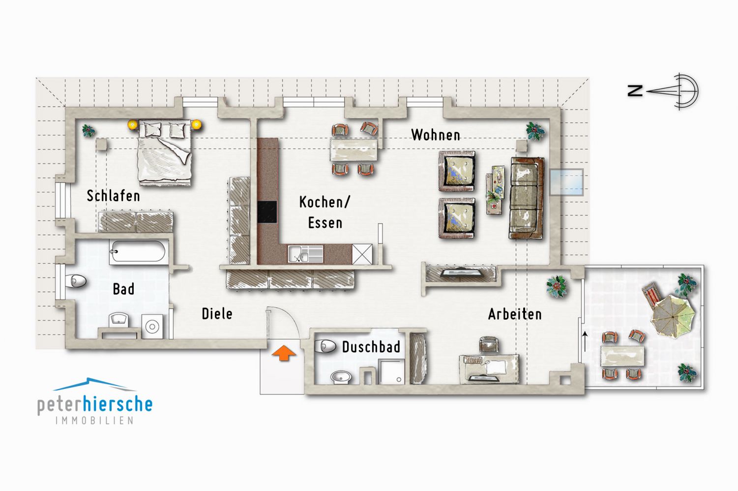 Die Objektdaten sowie sonstige Angaben zum Objekt beruhen auf erteilten Angaben des Auftraggebers/Eigentümers. Es obliegt dem Käufer, diese selbst zu prüfen. Eine Haftung für Richtigkeit, Vollständigkeit und Aktualität dieser Daten und Angaben ist ausgeschlossen. Grafische Darstellungen dienen dazu, Ihnen das Projekt verständlich darzulegen. Diese Darstellungsform erhebt keinen Anspruch auf Detailtreue. Die Möblierung in den Grundrissdarstellungen sowie in den Visualisierungen stellt lediglich einen Einrichtungsvorschlag dar und ist nicht im Angebot enthalten, soweit im Angebot nicht explizit angegeben ist, dass bestimmte Einrichtungsgegenstände im Kaufpreis der Immobilie eingeschlossen sind. Die Größe von Balkonen und Terrassen fließt zur Hälfte in die Wohnfläche mit ein. Flächenangaben sind circa-Angaben und beruhen auf den vom Eigentümer überlassenen Unterlagen, Daten und Informationen. Eine Haftung für deren Richtigkeit und Vollständigkeit kann deshalb nicht übernommen werden. Der Zwischenverkauf ist vorbehalten.